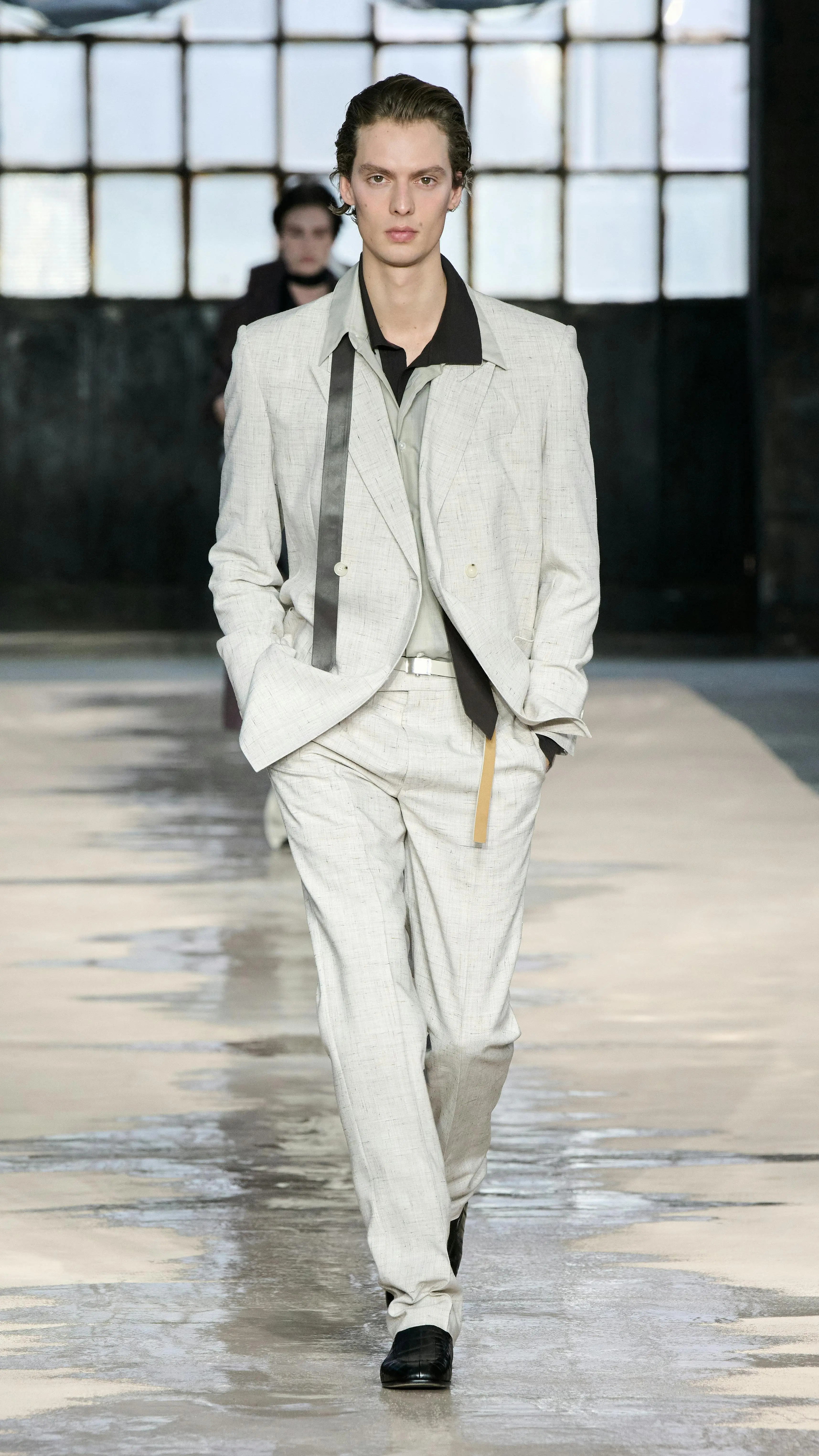 Ở cả womenswear và menswear, kỹ thuật tailoring vẫn là DNA cốt lõi của Boss. Trong khi womenswear tôn vinh sự đối lập qua các phom dáng mềm rủ và những thiết kế hở lưng đầy tinh tế thì Menswear tiếp tục kế thừa tinh thần Boss với những mẫu áo khoác và suit có cấu trúc nhưng được xử lý nhẹ nhàng hơn. Trên sàn diễn là những bộ suit chất liệu mềm mang dáng oversize thoải mái, đồng thời thử nghiệm với các chất liệu và finish mới từ da trắng mềm kết hợp lụa đến da cừu.