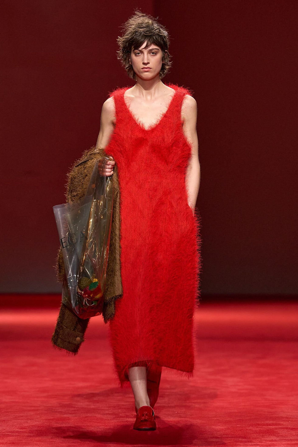 Phụ kiện hoàn thiện gần như mọi bộ trang phục. Mũ len giữ nhịp cho tổng thể; những chiếc mũ tua mang yếu tố trình diễn, gợi nhớ phục trang lãng mạn trong bản chuyển thể “Romeo and Juliet” năm 1968 của Franco Zeffirelli. Đầm và áo khoác dài ngang tunic kết hợp cùng đôi chân trần hoặc quần legging dày.