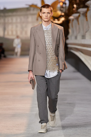 Có thể thấy, các thiết kế tailoring trong BST này được lấy cảm hứng từ BST “New Look” trứ danh của nhà sáng lập Christian Dior, ra mắt vào mùa mốt Xuân Hè 1947. Các mẫu áo blazer nam được biến tấu mới mẻ dựa trên phom dáng của áo khoác Bar với phần chít eo mang tính biểu tượng của người phụ nữ Dior.