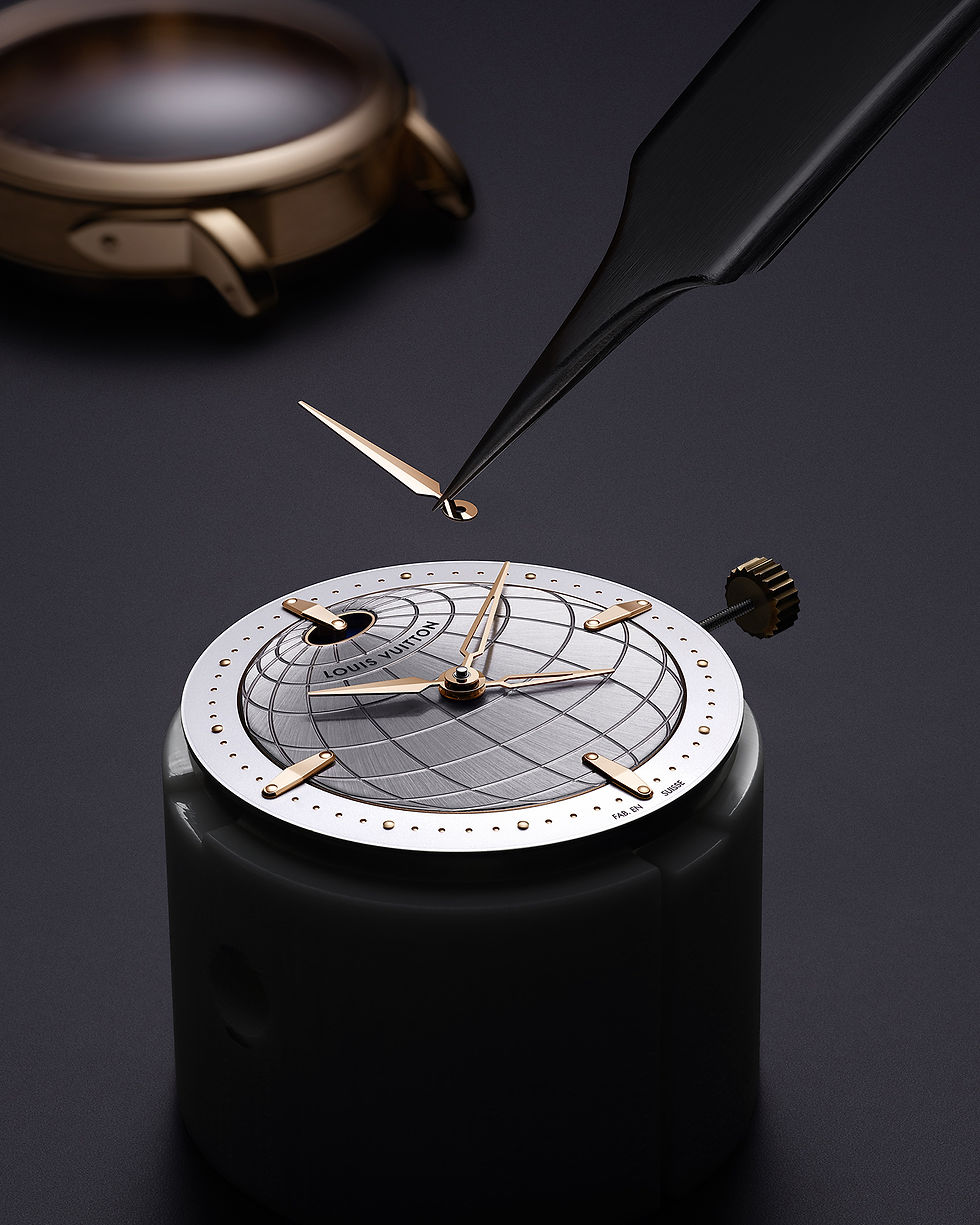Phiên bản đầu tiên tái định hình biểu tượng bằng vòng worldtime vẽ tay thu nhỏ. Kỹ thuật này là chuyên môn của La Fabrique des Arts, xưởng métiers d’art trực thuộc La Fabrique du Temps Louis Vuitton. Quy trình thực hiện đòi hỏi độ tập trung cao: 35 sắc độ được đặt lên bề mặt bằng cọ đầu mảnh, từng lớp một. Sau mỗi lần phủ màu, mặt số được đưa vào lò sấy để cố định sắc tố trước khi tiếp tục. Hoàn thiện một mặt số vì thế kéo dài trọn một tuần làm việc.