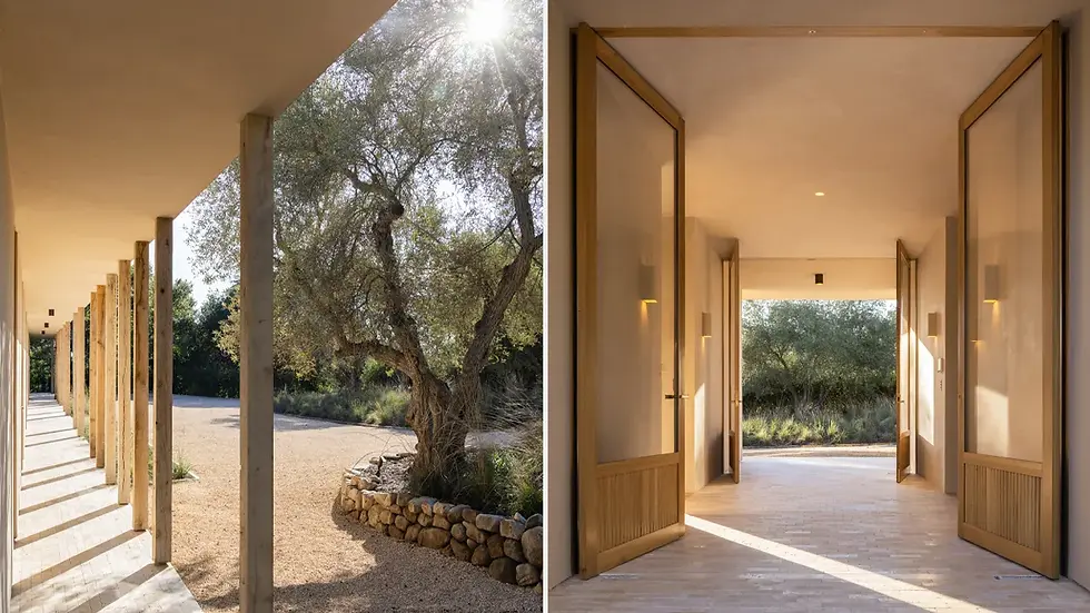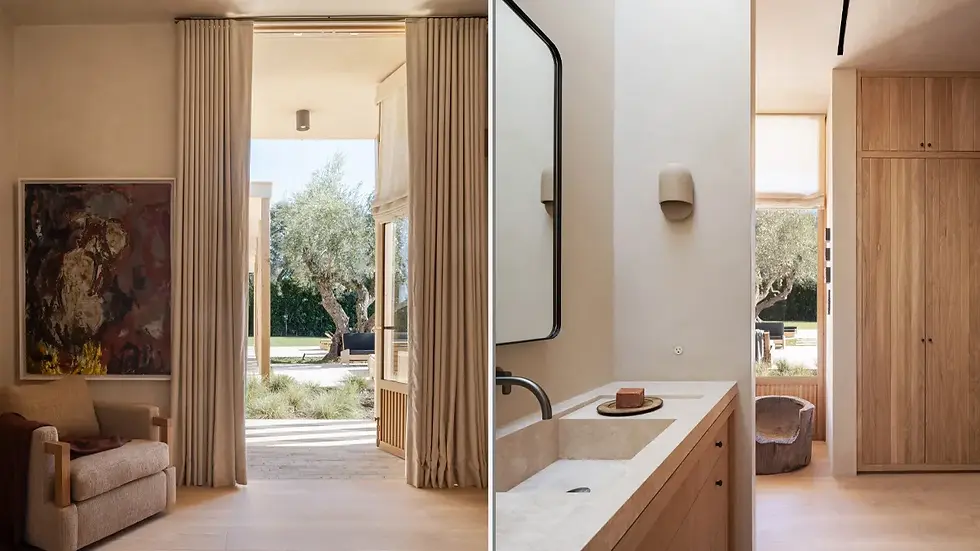 Ngôi nhà rộng 6.000 feet vuông này sở hữu một tầng, năm phòng ngủ và bảy phòng tắm, nổi bật với nội thất tối giản nhưng ấm cúng. Các món đồ nội thất chạm khắc thủ công đầy tính nghệ thuật, sử dụng vật liệu hữu cơ như vải lanh, mây tre, gỗ sồi. Bên cạnh đó căn nhà còn có giếng trời đón ánh sáng tự nhiên và cửa chính được xây dựng kiểu truyền thống của Pháp giúp tạo ra không gian liền mạch giữa trong nhà và ngoài trời.