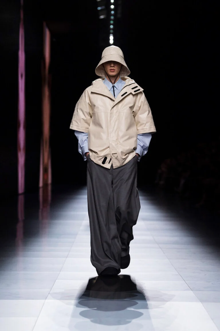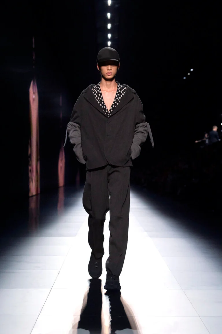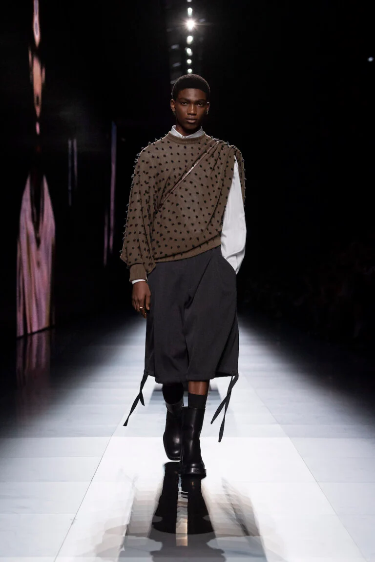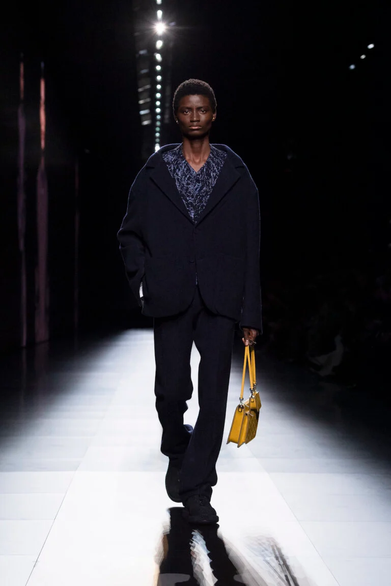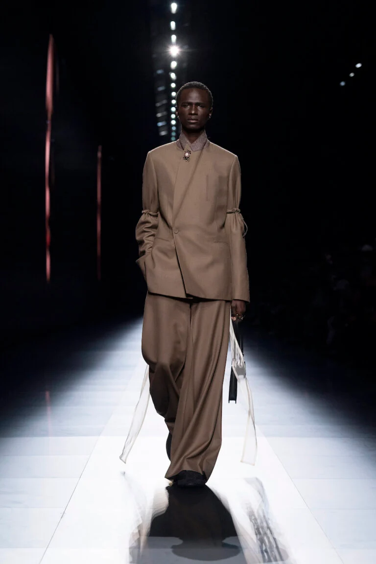 Vẫn sử dụng âu phục làm xương sống của toàn bộ BST, nhưng lần này, Kim Jones không chỉ lồng ghép tinh thần phóng túng của streetwear – vốn là thế mạnh của nam NTK từ trước đến nay, mà còn tô điểm tinh thần phi giới tính thời thượng bằng loạt chi tiết “mượn” từ đồ nữ.