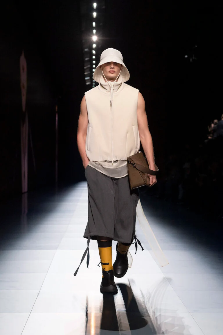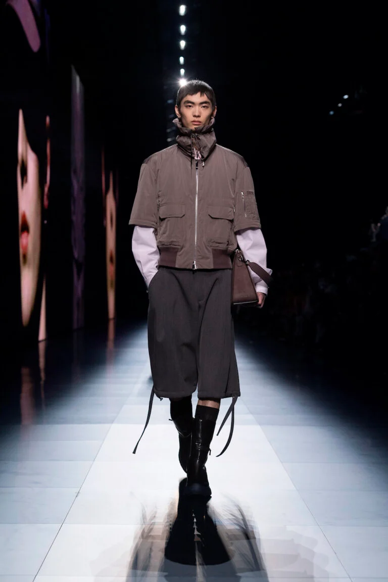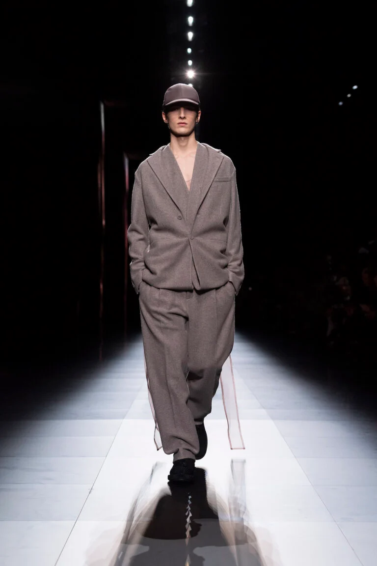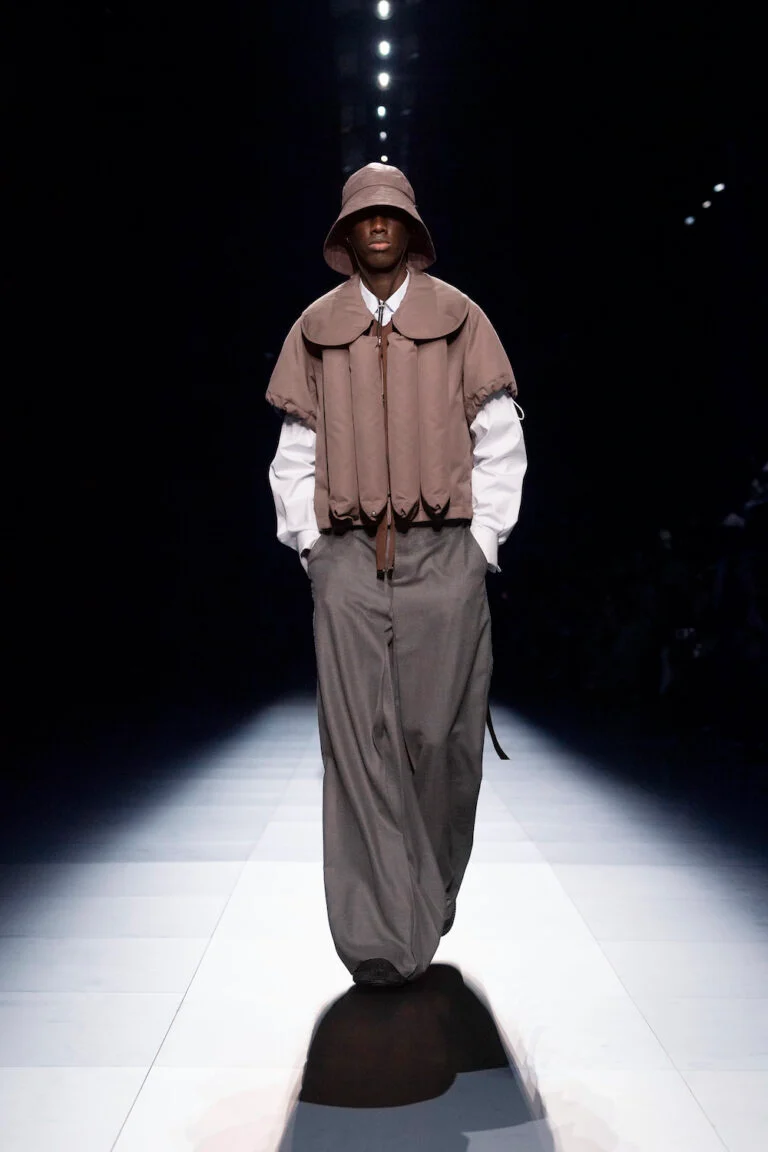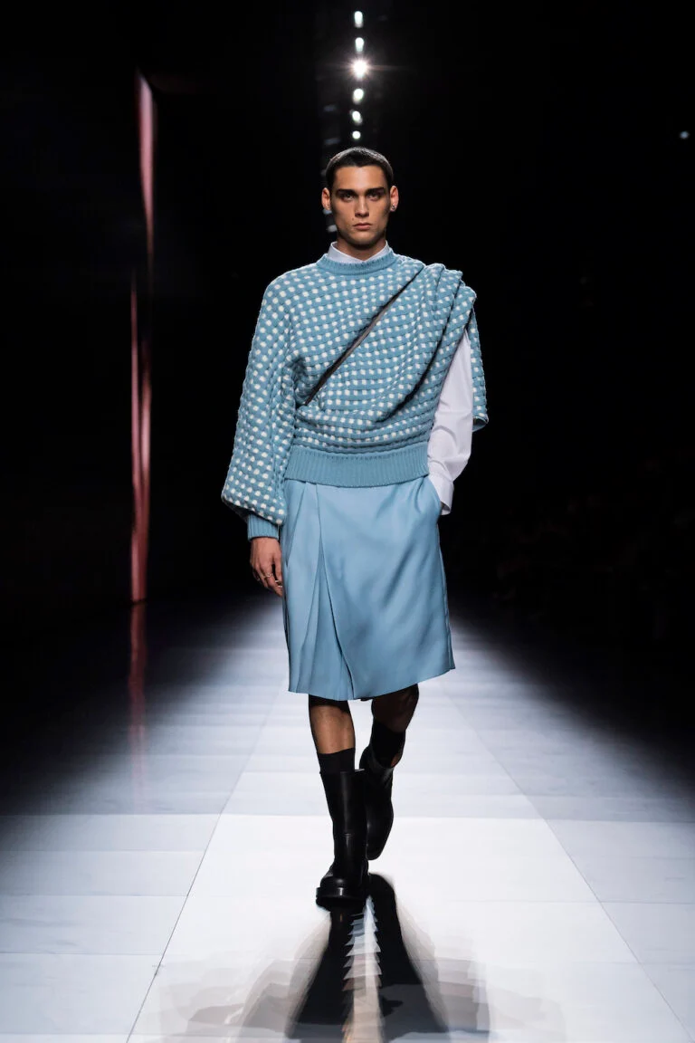 Vẫn sử dụng âu phục làm xương sống của toàn bộ BST, nhưng lần này, Kim Jones không chỉ lồng ghép tinh thần phóng túng của streetwear – vốn là thế mạnh của nam NTK từ trước đến nay, mà còn tô điểm tinh thần phi giới tính thời thượng bằng loạt chi tiết “mượn” từ đồ nữ.