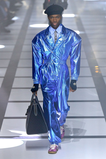 Điểm nổi bật của BST Gucci Exquisite không chỉ nằm ở các thiết kế phi giới tính, mà còn ở màn collab bùng nổ giữa Gucci và adidas – thương hiệu thời trang thể thao có tầm ảnh hưởng lớn ở thị trường châu Âu từ những năm 70 cho đến tận ngày nay. Có thể thấy, sau ngần ấy năm, adidas vẫn giữ phong độ là thương hiệu sportwear mang đến sự thanh lịch và năng động trong từng thiết kế. Tinh thần đó đã dẫn lối Alessandro Michele khao khát khám phá sự đột phá đến từ phép lai giữa tailoring và sportwear, hay nói một cách cụ thể là giữa đồ suit và tracksuit.