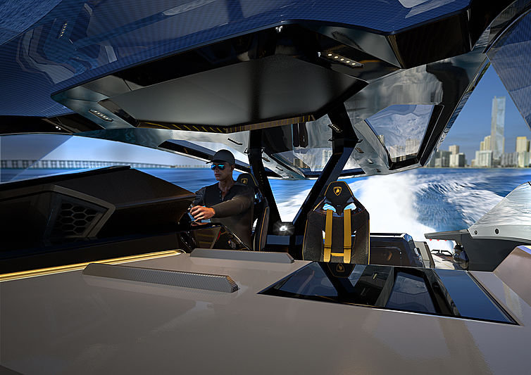Những vật liệu mang hiệu suất cao được sử dụng để làm giảm trọng lượng du thuyền cũng như tạo ra những điểm nhấn riêng biệt. Bên cạnh đó, các đường nét đặc trưng của Lamborghini như các mảng hoa văn lục giác, màu sắc mạnh và cá tính đều được tìm thấy trong từng đường nét.