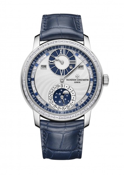 Thể hiện một cách hoàn hảo tinh thần sáng tạo của Vacheron Constantin, tạo tác độc bản này được chế tác bởi bàn tay tài hoa của các nghệ nhân. Trên mặt số với những chiếc kim vàng trắng, nghệ nhân guilloché đã khắc hoạ một hoạ tiết xoắn ốc tinh tế, tô điểm bởi một hàng 44 viên kim cương cắt baguette viền quanh vòng bezel. Mặt số tông màu bạc cũng được thiết kế với viền bằng đá quý đối diện vạch phút, đường viền bao gồm 36 viên kim cương cắt baguette xen kẽ 10 viên ngọc bích được đặt ở các vị trí cách nhau 5 phút. Sự lấp lánh của sapphire càng được làm nổi bật hơn bởi hai mặt số phụ hiển thị lịch mặt trăng và giờ, với cùng tông màu lam sẫm.